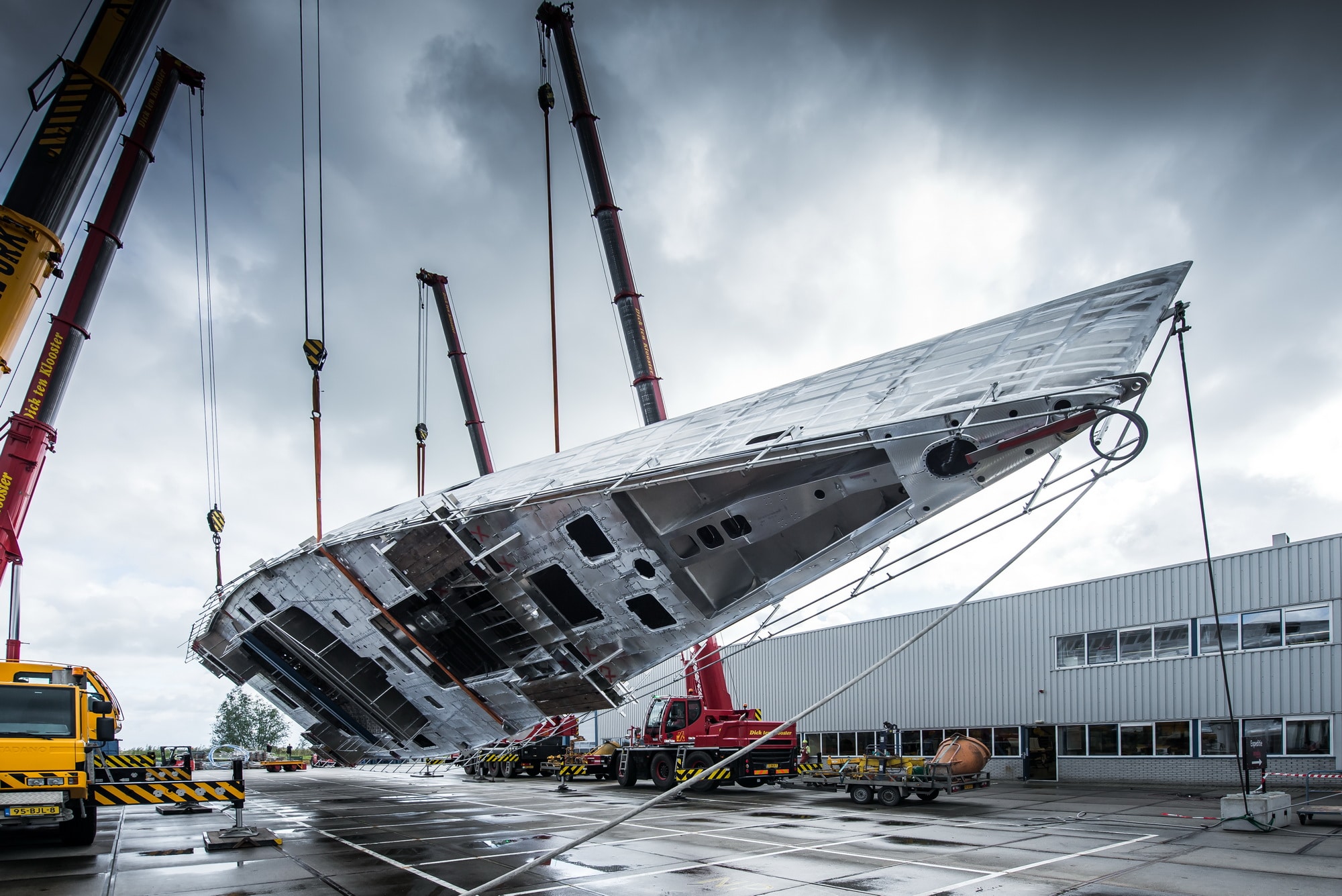 So what exactly is Featherlight? Project 405 is being built behind firmly closed doors and Royal Huisman is keeping its cards close to its chest. ‘Featherlight is a design and engineering methodology aimed at providing a lightweight aluminium construction from the outset,’ a spokesman for the shipyard says. ‘Its result isn’t a conventional superyacht relying on compromises to achieve a degree of weight reduction, but a purpose-driven effort to make the yacht truly as light as possible, and recapture any advantage that composite hulls might have, whilst benefiting from using aluminium. Featherlight comprises the leadingedge weight reduction knowledge that Royal Huisman has accumulated over recent projects, and adds the very latest intelligence and resourcefulness.’