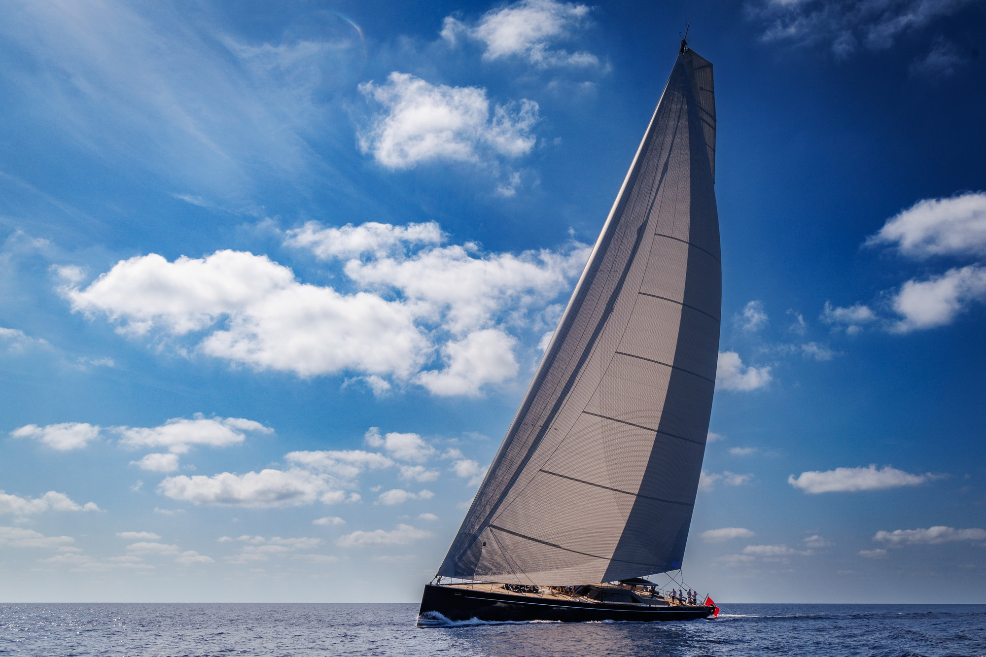 The owner’s requirements included a high-tech rig and very advanced gear to control the sails. He also inquired about the possibility of automating the running backstays and eliminating the huge deck winches controlling them. When a yacht is racing upwind, control of the running backstays during a tack is critical. Unless the ballet goes precisely as choreographed, the tack is stalled, boat speed drops, and – in the worst case – the rig may be jeopardized. Considering the backstay loads on a sloop with a 205ft mast, minimizing risk to the carbon-fiber mast and the people beneath it deserved serious attention.